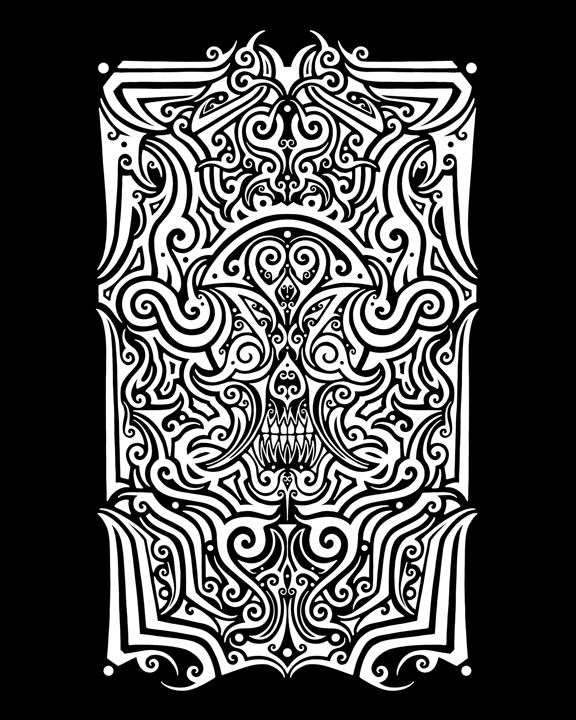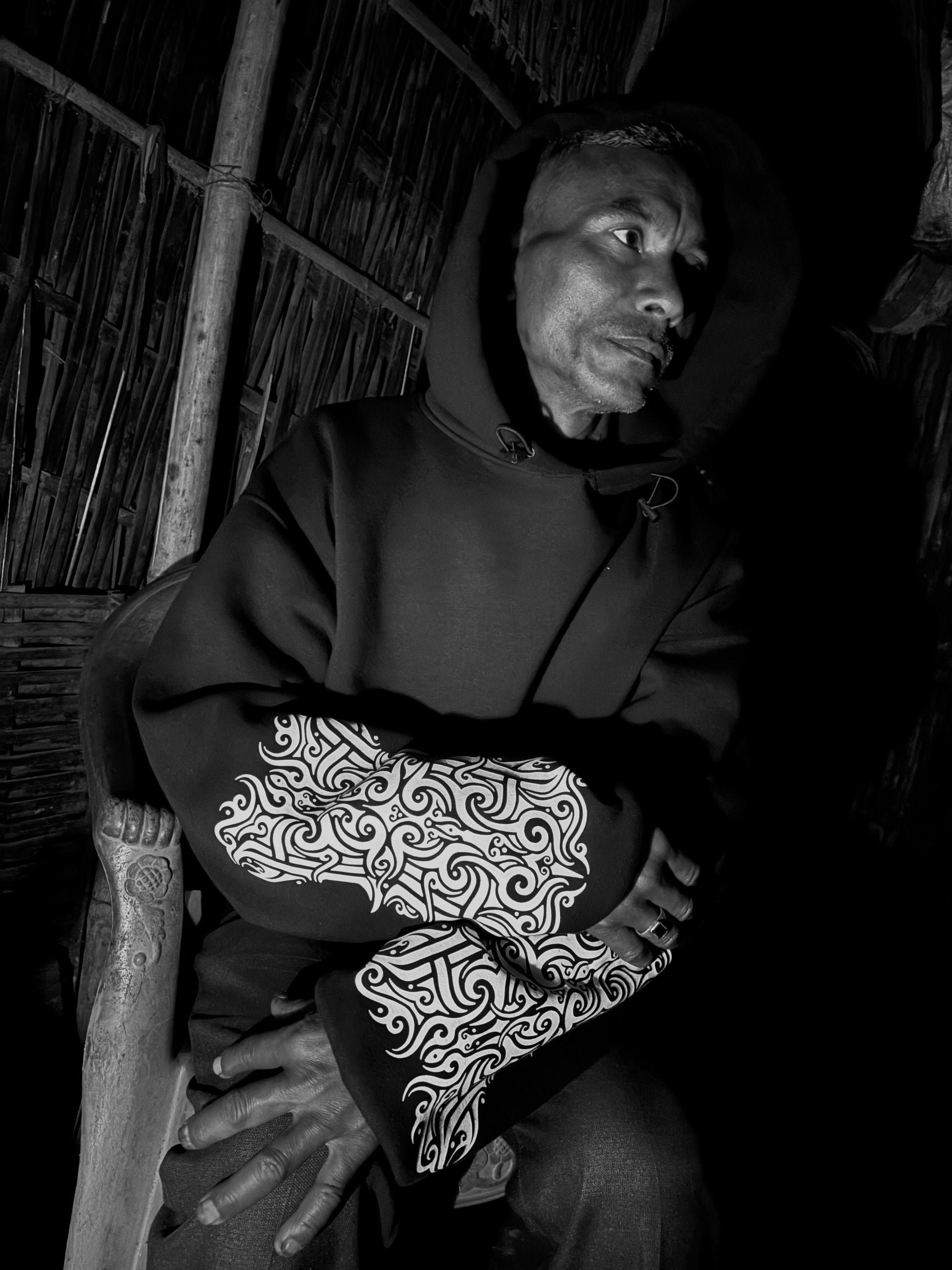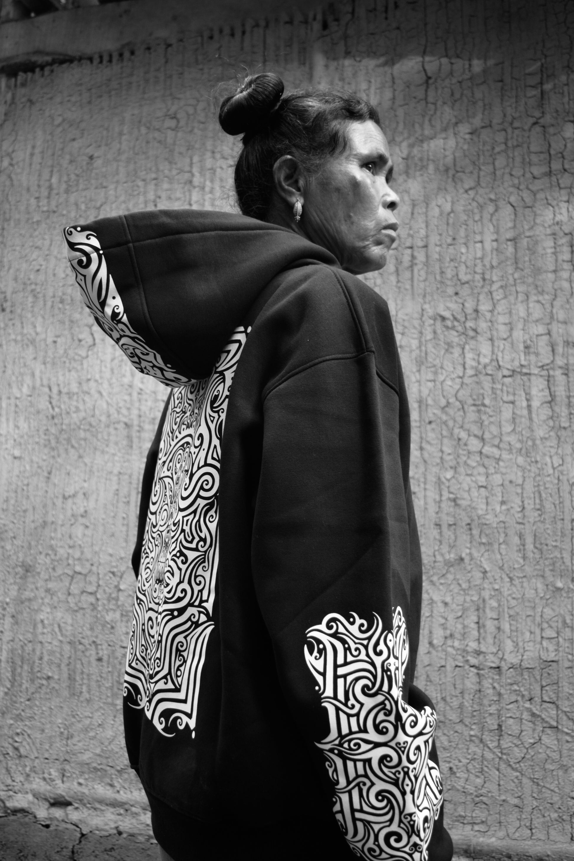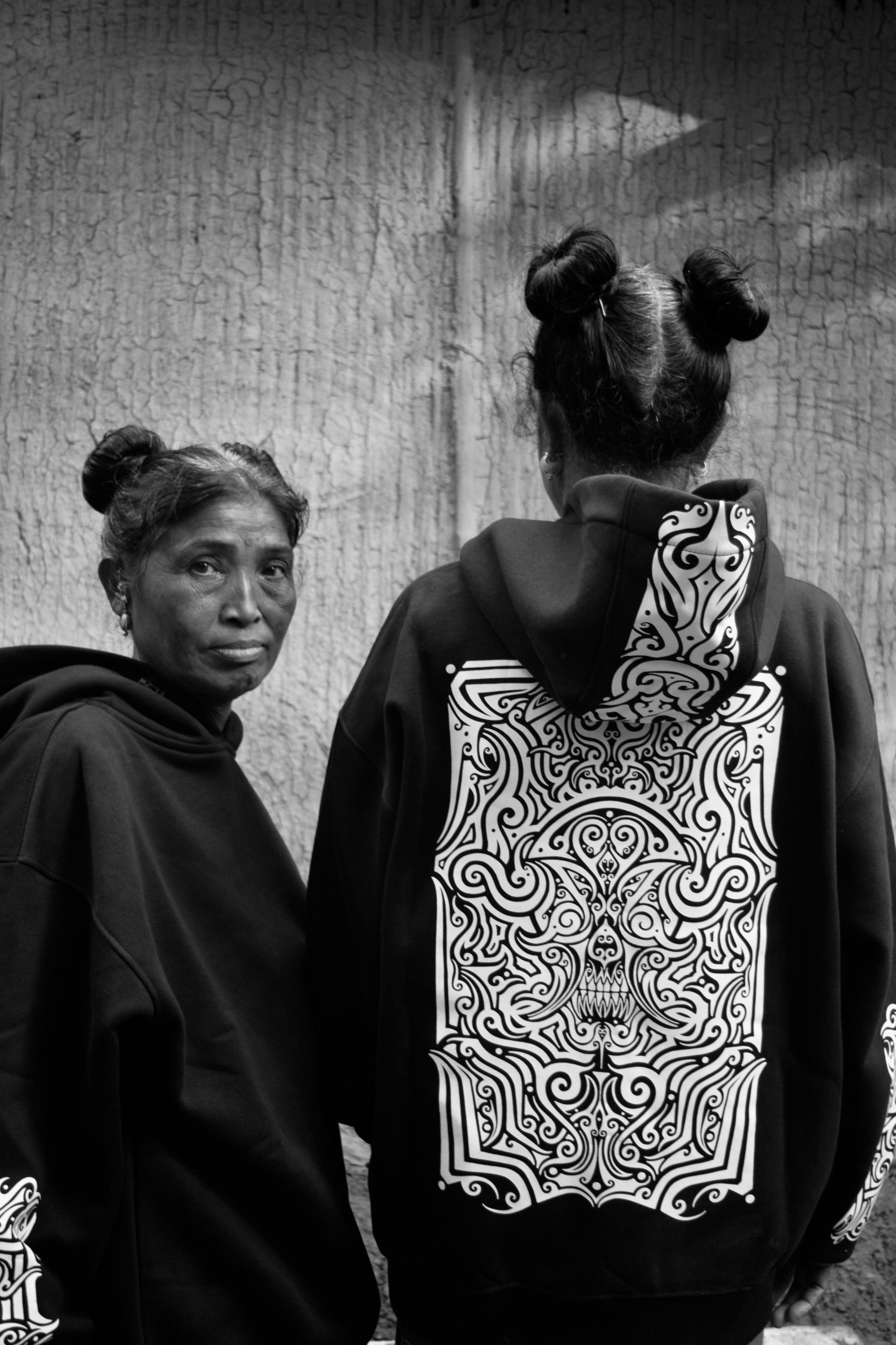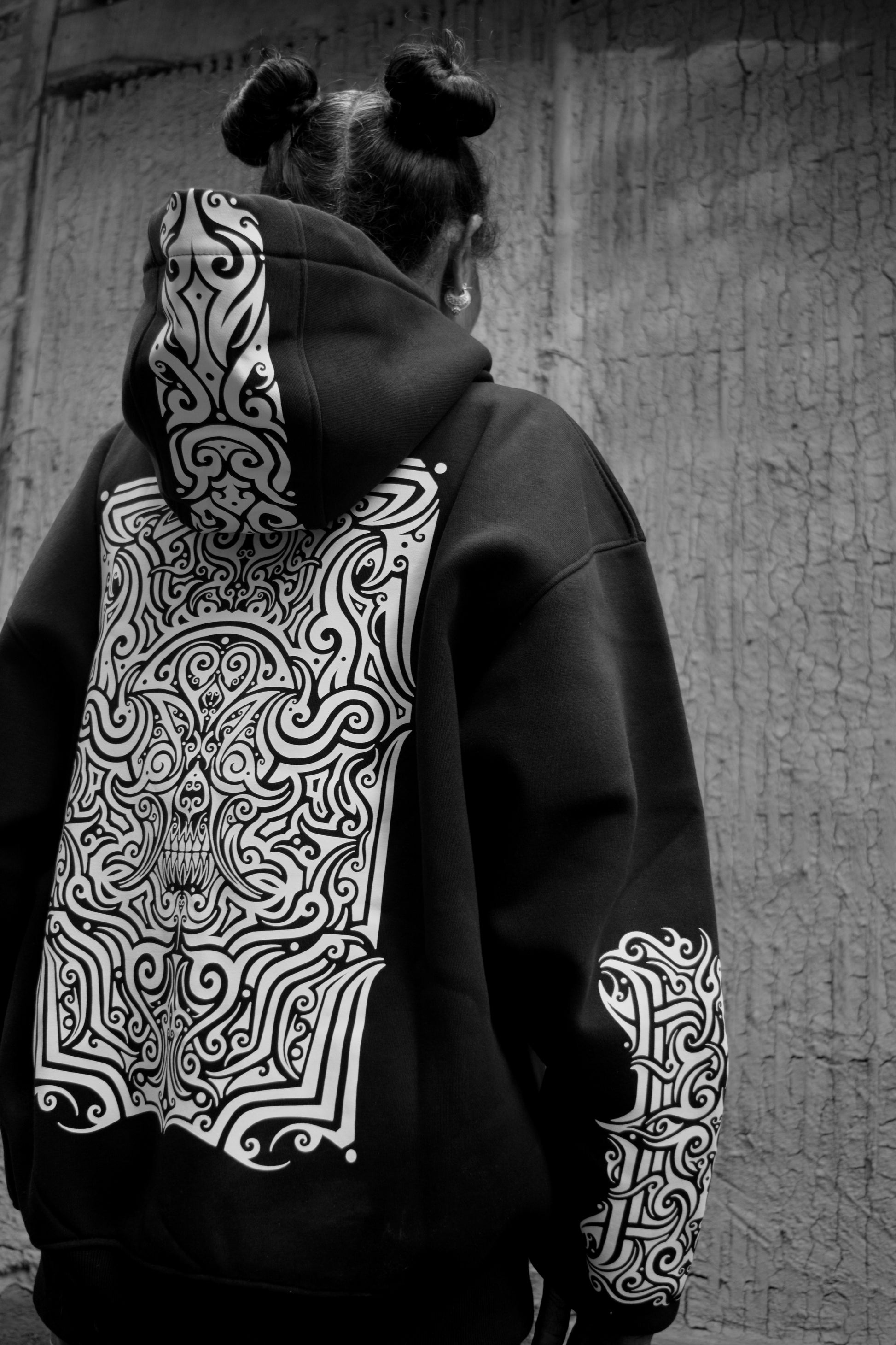 The primary source of inspiration for the design of this hoodie are the headhunters of Nagaland (North-East India) and Borneo. The primal practice of headhunting and the skillful ornamentation of the collected skulls have inspired me to do this project.
