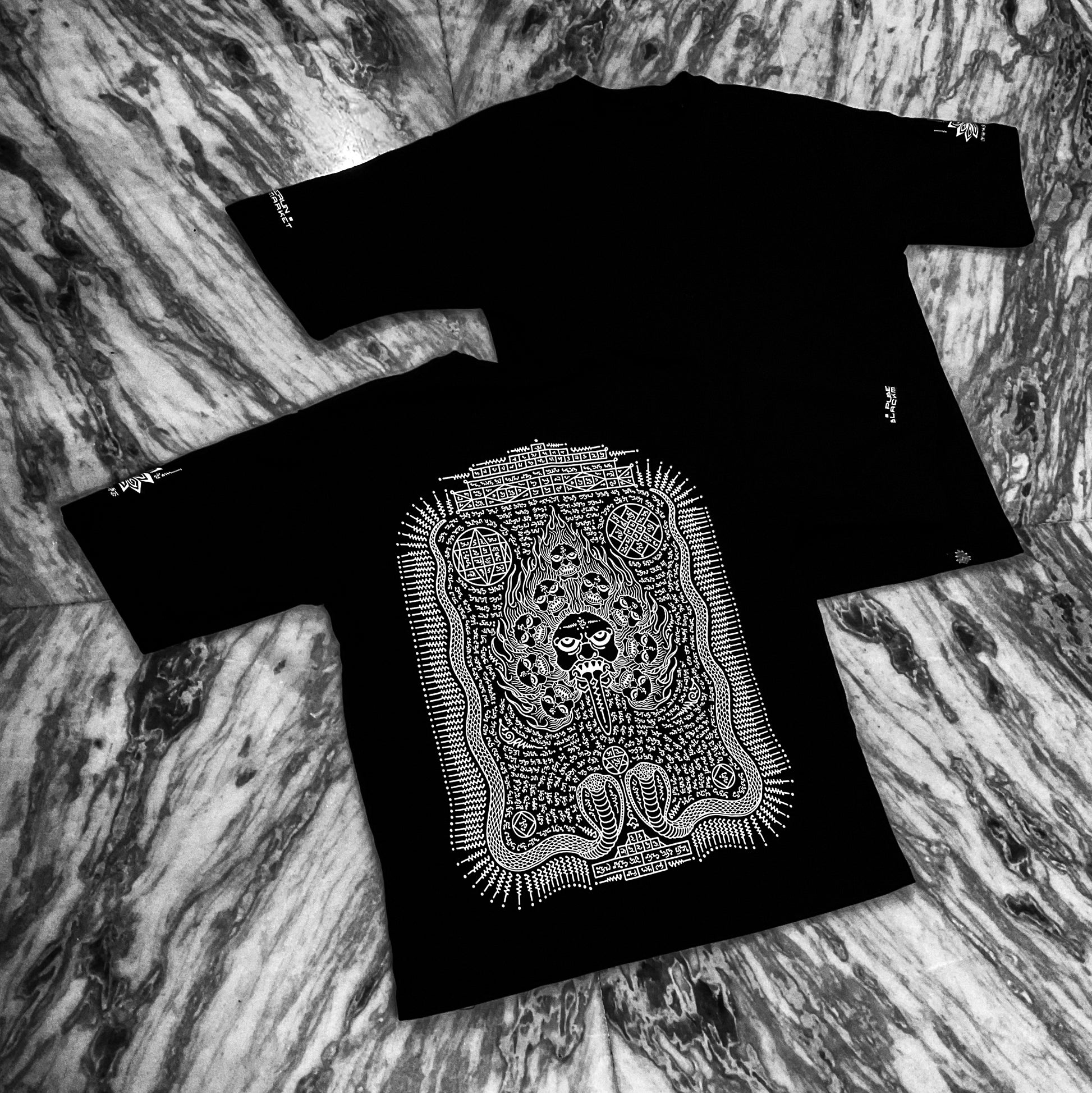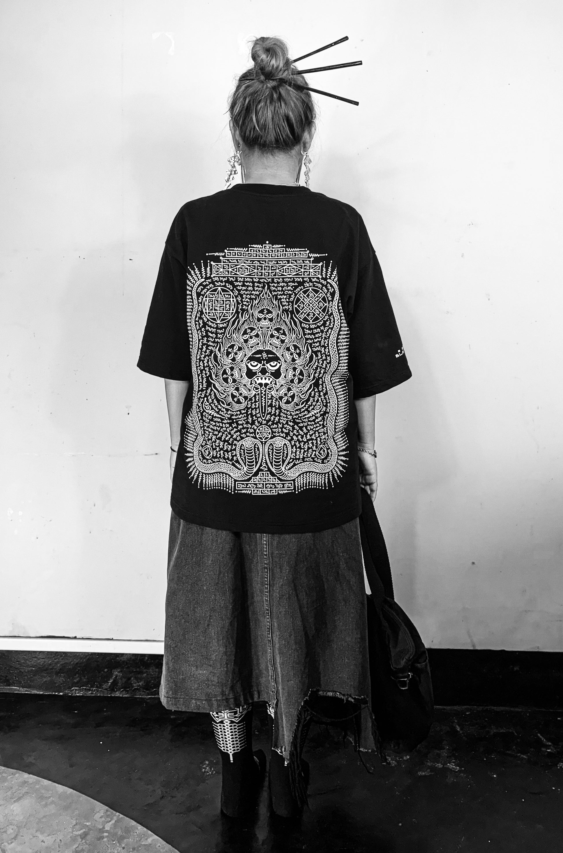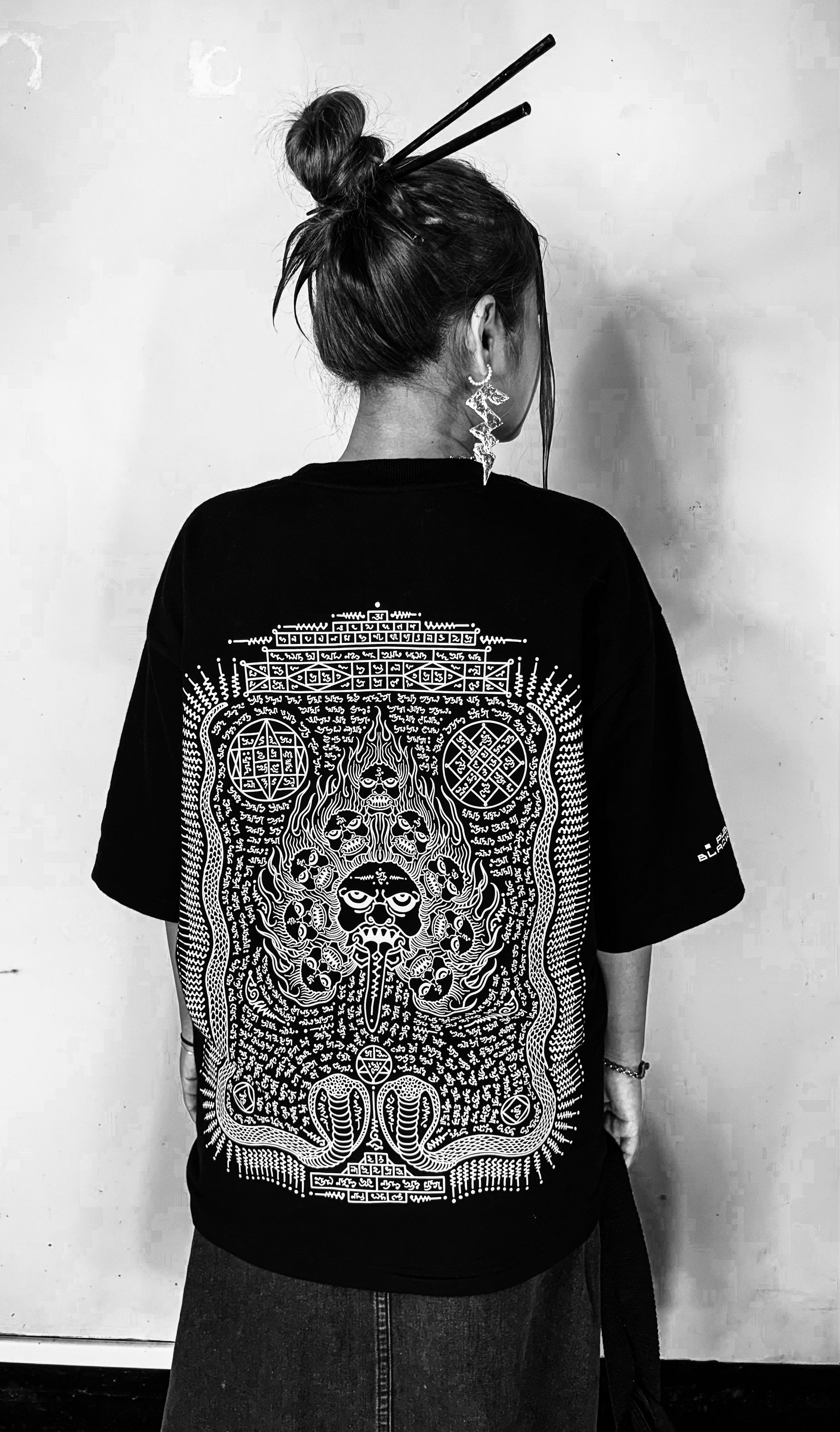 The entire composition of this design resembles that of a Sak Yant backpiece. The central deity used for this piece is ‘Raavan’, the warrior king in the story of ‘Ramayan’. The arrangement of his 10 heads is inspired by the traditional, theatrical masks of Majuli (a river island in Assam). The geometrical shapes in this artwork are inspired by ancient Vedic and Buddhist yantras.